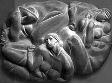 Душа праведна![]() У Національному художньому музеї України — знаменна подія: виставка «Проект «7514» Володимира Наконечного. Цей скульптор родом із Вінниччини, живе й працює у Дніпропетровську, де біля Історичного музею ім. Дмитра Яворницького стоїть пам’ятник його засновникові, створений В.Наконечним. Олена Годенко, куратор виставки, її назву пояснює так: «7514 — це рік, у якому ми живемо, згідно з давнім українським календарем». І справді, саме такий культурно-хронологічний діапазон вітчизняної історії осягає митець. Під виставку робіт скульптора Наконечного відведено дві зали. Експозиція першого розкриває творчий розмах митця — від української сучасності до арійсько-аратської давнини; від картинно-реалістичних робіт по дереву й каменю до бронзового модерну. А другий зал присвячено одній темі: осмисленню образу Козака Мамая. Простежується закономірність: що глибше у тисячоліття і ближче до джерел культури, то більше архетипового, загальнолюдського, то менше недовговічних матеріалів… Найархаїчніша за змістом робота має подвійну назву: «Прітхіві–Дьяус» та «Європа і Зевс». Тут окреслено культурний розвиток від «індоєвропейської спільноти народів» десь V — III тисячоліть до Різдва Христового (або до нашої ери; приблизно між 1108 — 3808 роками зазначеного у назві виставки календаря) до античних греків, які стали одними з нащадків тієї спільноти. Авангардистська композиція скульптури поєднує жіночу й чоловічу статури Прародителів сущого, увінчаних знаком Сонця (хрестом у золотавому колі) між рогами зодіакального сузір’я Тельця. Археологічний прообраз композиції знайдено на вапняковій стелі одного з аратських («трипільських») курганів села Усатове, що злилося нині з Одесою… Типові статуетки трипільської археологічної культури нагадує ще одна бронзова скульптура — «Народження Олени». А для арійських курганів Півдня України кінця ІІІ тис. до н. е. (близько 3308 — 3108 рр., за «Проектом «7514») характерним став Пушан — предтеча грецького Пана й литовського Пушкайтіса, «Пишний» покровитель роду й достатку, знавець щасливих шляхів і провідник воскреслих небіжчиків. Автор однойменного твору сягнув найпотаємніших глибин образу, міфів, ритуалів. Представлено скорчену, як ембріон, людину, яка ніби намагається зняти із себе голову барана чи цапа. Арійські же прототипи — «конеголовий скіпетр» з кургану біля с. Суворове на Одещині та «вершник» -стела у вигляді людиноподібного божества з курганів с. Керносівка на Дніпропетровщині — митець поклав в основу, як «Композицію І», численних скульптур Козака Мамая. «Материнський косак» (від коси-«оселедця») — ось що означала ця назва за часів порубіжжя і матріархату, і патріархату. «Козак Мамай, душа праведна» — підписували українці канонічне зображення дохристиянського, тому й без нашийного хреста, зображення цього героя «народних ікон». Найперша з них, якій приблизно 45 століть, міститься біля центрального вівтаря славнозвісної Кам’яної Могили (на Запоріжжі). До народного канону — світове дерево, до якого прив’язано коня, а поряд людина — найближча «Композиція Х». Інші ж нагадують Шіву й, найбільше, Будду. Індійські брахмани й тибетські лами знають, що рід богорівного Будди прийшов до Бгарати-Індії з українського Запоріжжя. Нашим рідновірам відомо ще більше: легендарному Козаку Мамаю пер