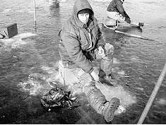 На останньому льоду у Гусинцях![]() Кореспондент «Персоналу Плюс» досліджує «екстремальні розваги справжніх чоловіків» Вже зранку 23 лютого стало зрозуміло, що запланована на цей день риболовля проходитиме в складних погодних умовах. Шалений вітер, колючий дощ і найгірше для зимового рибалки — неочікувано раннє тепло ставили успішність нашої поїздки під сумнів. Проте старенький, але ще міцний, «жигуль» 6-ої моделі впевнено долає майже танкову дорогу (поблизу — полігон у селі Дівички) у напрямку села Гусинці, що в Бориспільському районі Київської області. Власне, села давно тут немає: його було зруйновано під час створення Канівського водосховища, і на згадку про безглуздість тих років височить над «морем» лише напівзатоплена Гусинська церква і дзвіниця без бані. Вночі якийсь старий запалює на дзвіниці каганець, і містичність цієї події зворушує грубі душі рибалок. Тож, подолавши дорогу в стилі «Париж—Дакар», кореспондент «Персоналу Плюс» вже отримав дозу адреналіну і зрозумів, що життя таки є і за стінами офісу. Дніпро зустрів нас непривітно, вітер і дощ заважали ловити, але окунь таки брав. Небезпека чатувала на тих рибалок, що рушили на острови, ближче до фарватера (він звільнився від льоду). Увечері вони поверталися як по мінному полю, обминаючи численні промоїни. Ми ж вмостилися у затишній затоці і не прогадали. Ранок і вечір потішив окунями «на долоню». Риба, налякана штормом, очевидно шукала схованки і заходила у затоки, під лід.