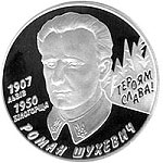 Як повідомляє НБУ, монета виготовлена зі срібла, якість карбування — пруфф, маса — 15,55 г, діаметр — 33 мм, тираж — 3 тис. штук. Група монети рифлена. На аверсі монети розташована композиція стилізованої ламаної дороги, що піднімається вгору, на фоні дороги напис: Слава Україні!, угорі — Малий герб України й напис півколом — Національний банк України, під яким — номінал і рік карбування монети, а також позначення металу, його проби — Ag 925, маси в чистоті й логотип Монетного двору НБУ. На реверсі зображений портрет Шухевича на фоні стилізованого лісу, що символізує військовий опір окупантам і національно-визвольний рух на території України, а також розташовані написи: Героям слава! (праворуч), 1907/Львів/1950/Білогорща (ліворуч) і — унизу півколом — Роман Шухевич. Автори ескізу — Володимир Таран, Олександр Харук, Сергій Харук, автор моделі — Анатолій Дем’яненко. За матеріалами УНІАН |