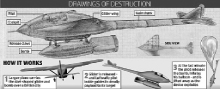 Бомба-дротик Гітлера![]() Зброя з високою точністю ураження та швидкістю 700 миль на годину з точністю могла визначити цілі нацистів та нанести суттєву шкоду Англії. Принаймні так вважали німецькі вчені, коли проектували цю зброю терору. Гітлер все більше і більше зневірявся знайти способи розладнати плани своїх противників наприкінці Другої світової війни. І тоді нацисти придумали Сайлент Дарт (в перекладі з англійської – Мовчазне перо або дротик Прим. редакції). Планер повинен був звільнити від великих літаків. Керуємий пілотом Люфтвафе, міг спікірувати на земля, несучи 1 000 кг бомбу. В останній момент пілот міг випустити бомбу та наповнити великий аеростат, прив’язаний до літака. Припускалося, що доки бомба досягне ціль, аеростат віднесе Дарт далеко від небезпечної зони, мандрівка, таким чином, могла бути небезпечною. Ці плани, які побачили світ через 60 років після їх створення, можуть здатися такими, що не відповідають дійсності, однак малюнки Дарта олівцем, які були знайдені союзниками в липні 1945 року, для нацистів, можливо, представлялися досить реальними. Аукціоніст Ричард Дейві, який реалізує ескізи, каже: «Плани не були датовані, тому ми не знаємо не були вони реалізовані через те, що не вистачило часу, чи з іншої проблеми». Креслення знайшов Ріхард Рекс, якого було направлено до Німеччини з метою влаштування безкоштовних медичних закладів після Потсдамської конференції. Конференція була скликана задля того, щоб вирішити як переможена Німеччина повинна керуватися в післявоєнний час. Відставний комодор авіації, історик Грехам Питчфорк: «Ближче до кінця війни нацисти розвивали дуже багато дивних проектів. Яким би дивним це не уявлялось для нас, німецькі науковці відомі своєю винахідливістю. Вони були відчайдушними щоб розробити зброю терору, саме тому вони розробили V1, V2 та V3. |