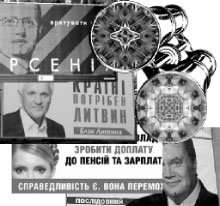 Компроматом не гребуватимуть — Ваш прогноз: як це відбуватиметься? — На мою думку, буде надзвичайно багато компромату, який уже заготовлено. В певний час претенденти виллють увесь той бруд не тільки на своїх опонентів, а й на голови виборців, які багато чого «відкриють» для себе. — До вже відомого про кожного? — Наприклад, Віктору Ющенку згадають всі його промахи за роки президенства. Це і зубожіння українського народу, і невдала політика щодо інтеграції України до Європи, і спекуляції національного банку з валютним курсом, коли долар стрибнув з п’яти гривень до восьми, і чимало іншого. В одній з газет я побачив фотографію нинішнього президента, підписану його передвиборчими словами-обіцянкою: «Україна буде сильною, заможною, європейською державою!».