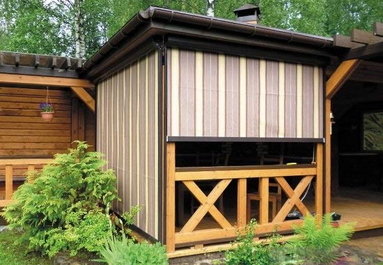 Варто звернути увагу, що маркіза має вагу понад 20 кг, що змушує зробити якісну і надійну установку. Кошикові маркізиКошикові маркізи (купольні навіси) - є ефектними маркізами з багатовіковою історією застосування. Купольні навіси відмінно захищають від сонця і дощу, тим самим оберігаючи предмети інтер'єру від вигоряння, а шибки вікон і вітрин, від бруду та пилу з фасадів бруду. Вони витримують широкий спектр температур (від-40С до +70 С) і не вигоряють протягом всього терміну експлуатації, а це, до речі, мінімум 5-7 років. Кошикові маркізи традиційно використовувалися для комерційних цілей - як прикраса і реклама в кафе, магазинах і ресторанах. Тканина маркізи натягується на поперечні промені (ребра), які складаються як віяло. Кількість променів може варіюватися: при більшому виносі від стіни зазвичай використовується більше променів. Кошикові маркізи виконуються у вигляді купола і встановлюються над вікнами або дверима. Вдало підібрані кольори створять яскравий образ закладу, що запам'ятовується і налаштує відвідувача на позитивний лад, а створення затемненої ділянки над вікном допомагає підтримувати комфортну температуру і захищає стіни від вигорання. Вертикальні маркізиВертикальна маркіза - це тентова конструкція, яка відкривається вертикально вниз. В основі конструкції вал і напрямні. Вертикальні маркізи бувають: відкритого і закритого типів. Якщо маркіза відкрита - то вал з тканиною є відкритим, а в якості направляючих виступають трубки або троси, по яких тканина з'їжджає вниз. Тентова тканина відштовхує воду і бруд, стійка до ультрафіолетових променів і не схильна до гниття. Вертикальна маркіза закритого типу - це тентова конструкція, де вал з тканиною знаходиться в коробі. Відсутній зазор між полотном тканини і направляючими. Така конструкція має відмінні естетичні характеристики: вона не впадає в очі сама по собі, але в той же час надає об'єкту завершеність і солідність. Вертикальні маркізи універсальні і успішно використовуються в заміському будівництві і місті. Вони захищають приміщення від надлишку сонячного світла і теплового випромінювання, перешкоджають перегріву в об'єктах з великою площею скління. За межею міста маркізи широко використовуються для терас, альтанок і поділу простору. Вони захищають від сонця, вітру, і сторонніх поглядів. |